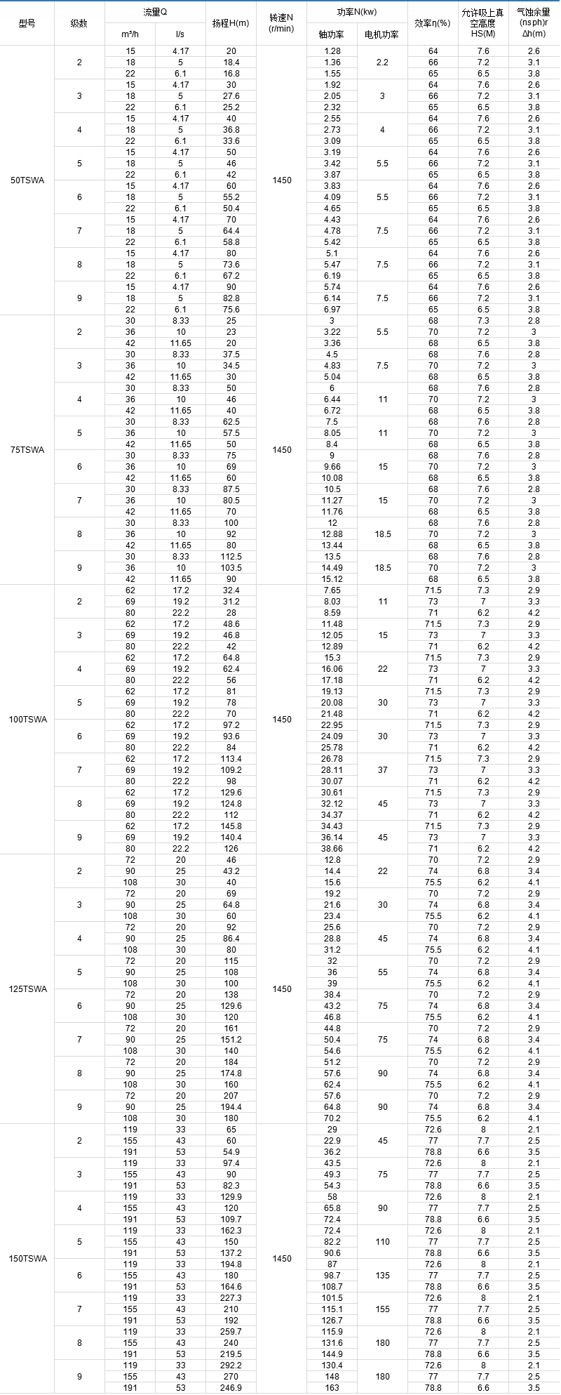 TSWA型多級離心泵全系列共5個品種40個規(guī)格,其性能范圍流量Q=1.5~191m3/h,揚程h=17~247m,轉(zhuǎn)速n=1450r/min。